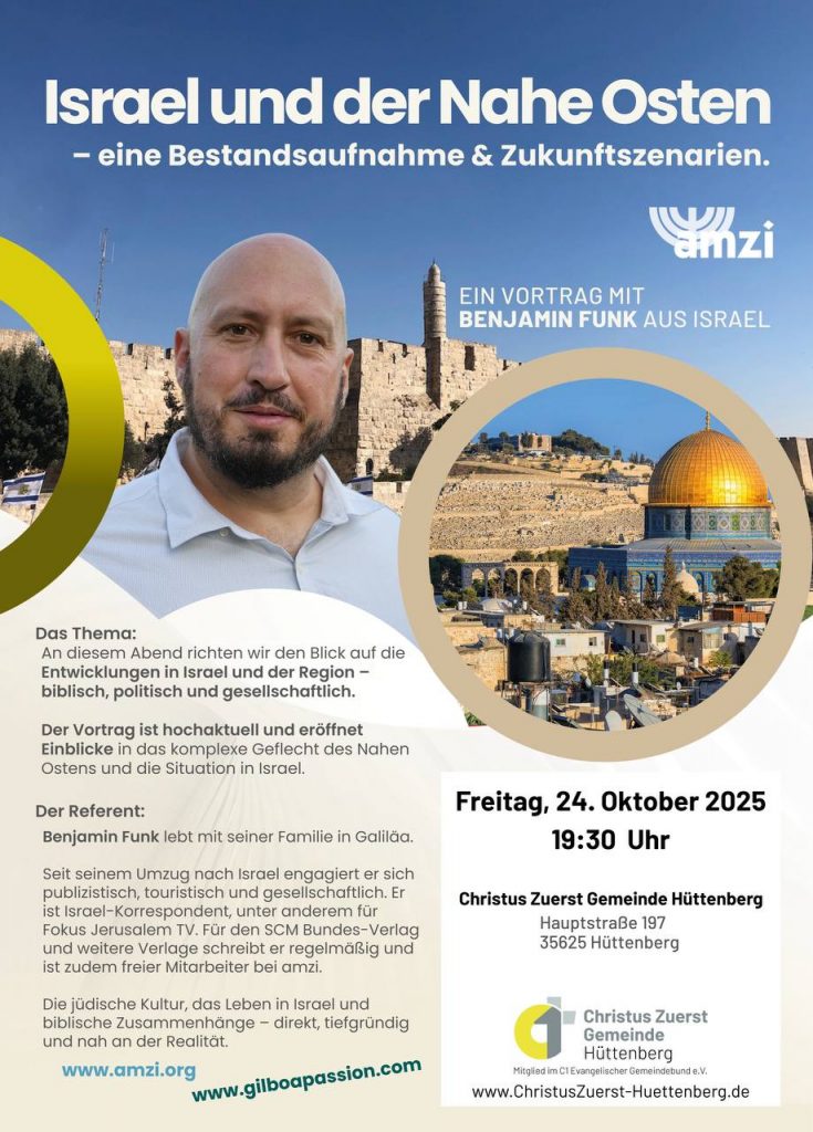 Und am 24.10.2025, 19:30 Uhr, kommt der Israel-Korrespondent Benjamin Funk, ein Deutscher aus Israel zu uns.