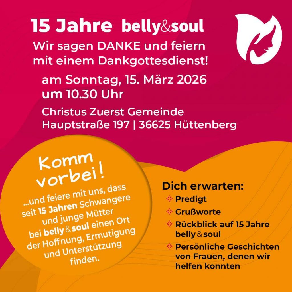 Wir feiern am 15.3. einen Dankgottesdienst. Der Verein „belly&soul“ wurde vor 15 Jahren gegründet und hat vielen Frauen in Not geholfen. Dieses Jubiläum wollen wir in aller Dankbarkeit unserem Gott gegenüber feiern!